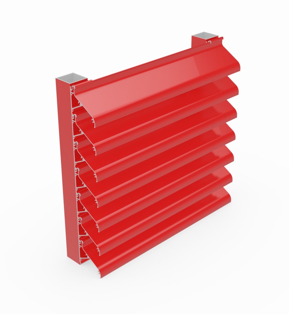 2″ Deep Horizontal Fixed Blade louver; high performance series; extruded aluminum construction; frame with channel profile; corner joints mitered and mechanically fastened, with intermediate mullions; gutters.
